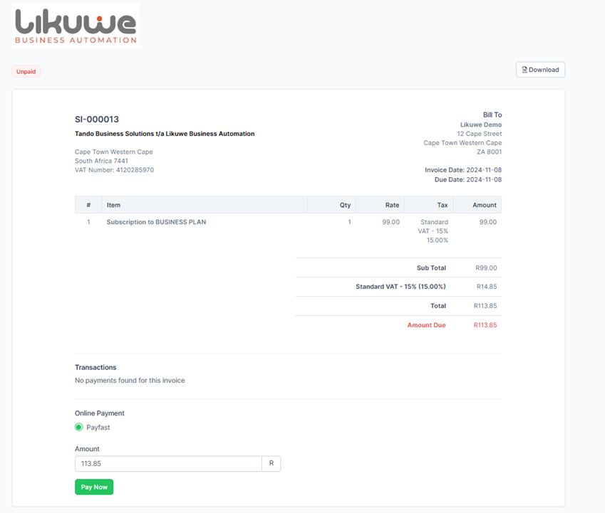An invoice will then be generated.