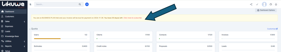 On the Admin Dashboard, view your subscription details, including the trial days left, plan, and next invoice date.